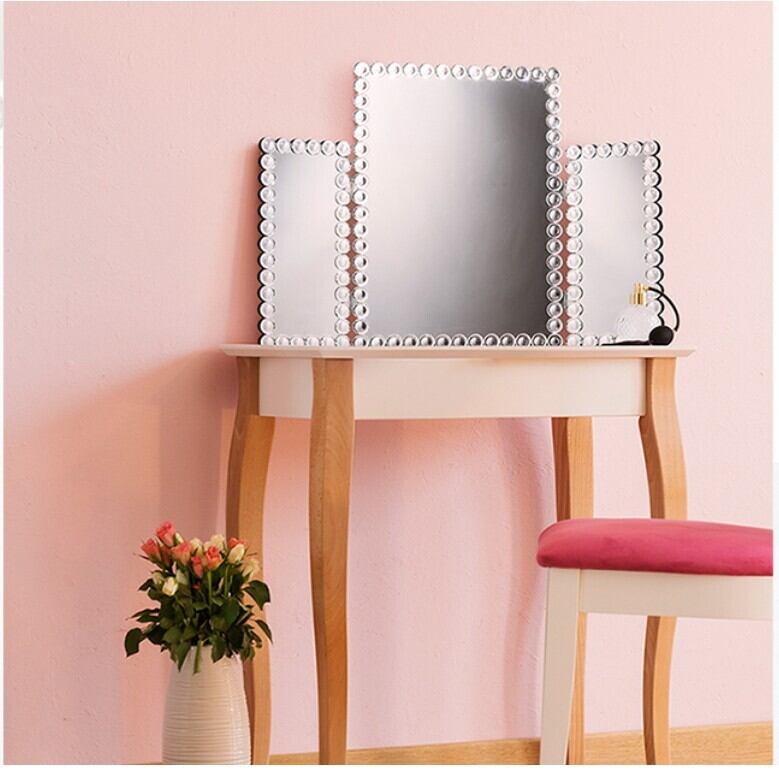 クリスタル調の装飾が豪華な三面鏡。さまざまな角度の身だしなみチェックが便利に。