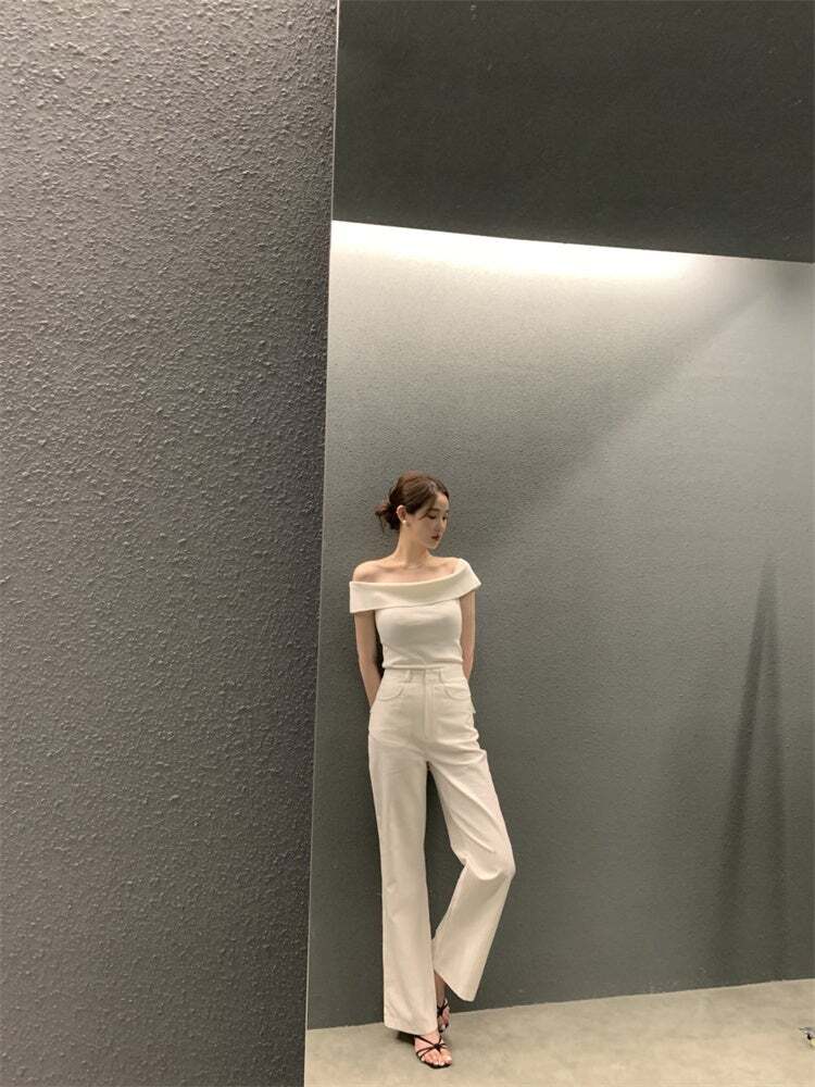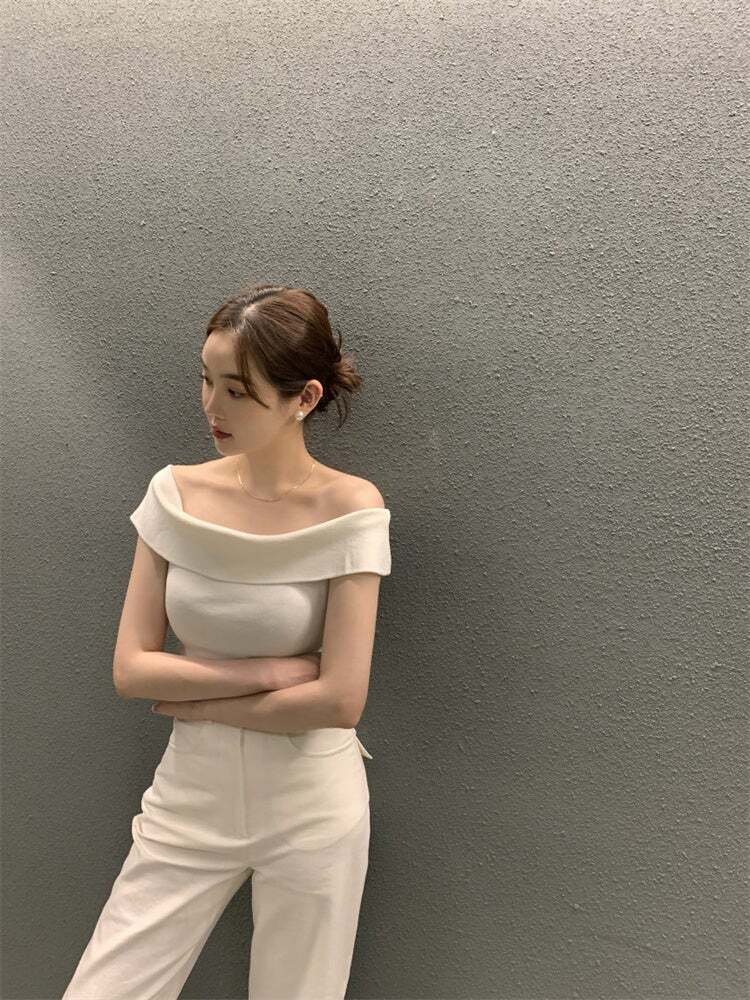韓国ファッション ボーダー オフショルダー 半袖 ニットトップス デザインセンス